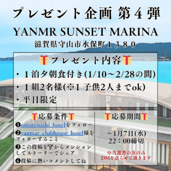 🟢応募期間:2025/12/31(水)〜2026/1/7(水)instagram【公式】YANMR SUNSET MARINA・1組2名様(家族連れの場合は、子供2人までOK) ※1 子供の対象は、小学…